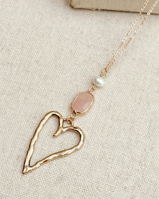 8-4583 Gracie Rose Gold Rose Quartz & Freshwater Pearl Open Heart Necklace