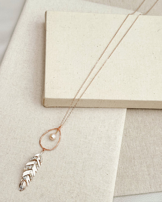2-6142 Gracie Rose Rose Gold Feather Pendant Necklace with Rhinestones & Pearl